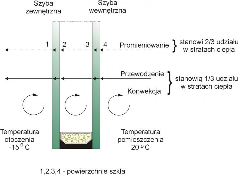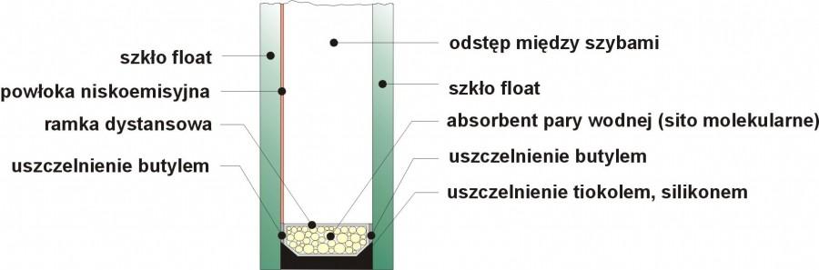 Szyby ciepłochronne - głównym zadaniem stawianym przed szkłem budowlanym jest obecnie ochrona cieplna. Najwięcej ciepła z budynku ucieka przez komin i wywietrzniki grawitacyjne oraz przez okna - razem ponad 60% strat. Około 30% przenika przez ściany i dach budynku. Miarą określającą wielkość strat ciepła jest wartość współczynnika przenikania ciepła U, który jest ilością ciepła przenikającą w jednostce czasu przez element budowlany o powierzchni 1m2 przy różnicy temperatur pomiędzy wewnętrzną a zewnętrzną powierzchnią 1 stopień K. Współczynnik wyrażany jest w W/m2*K. Szyba ciepłochronna składa się z dwóch szyb, w tym jedna to szyba z niewidoczną warstwą kombinacji metali szlachetnych, która zapobiega przenikaniu ciepła z pomieszczenia na zewnątrz. W przestrzeni międzyszybowej umieszczony jest gaz (argon, krypton lub ksenon). U- współczynnik przenikania ciepła; Rw - izolacyjność akustyczna; LT - przepuszczalność światła; LR - odbicie światła.