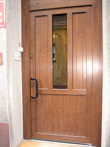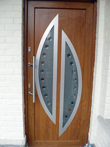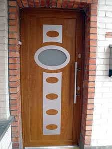 Drzwi PCV w kolorze orzech z szybą Reflex.