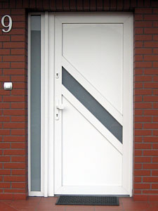 Drzwi PCV w kolorze białym z bocznym naświetlem z szybą mleczną.